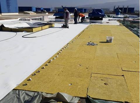 Çatıda sandvich panel üzerine buhar dengeleyici örtü serilir, üzerine iki kat 5cm+5cm taşyünü serilip dübel yardımıyla sabitlenir,