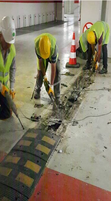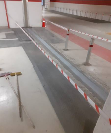 Gordıon avm 3A otoparkında bulunan dilatasyonlar üzerindeki hız kesme rampaları kaldırıldı, deforme olan dilatasyon bantları söküldü zemin kazınarak temizlendi.