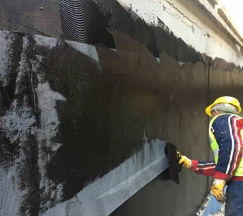 Bitüm astar perde yüzeyine en az 400gr/m² olacak şekilde fırça ile sürüldü. Astarın kurumasına müteakip BTM 2K 600 sürme yalıtım file kullanılarak ilk kat sürme yalıtım uygulandı. Birinci katın kurumasından sonra taze iken ikinci kat sürme yalıtım uygulanarak sürme yalıtım işlemi tamamlandı.