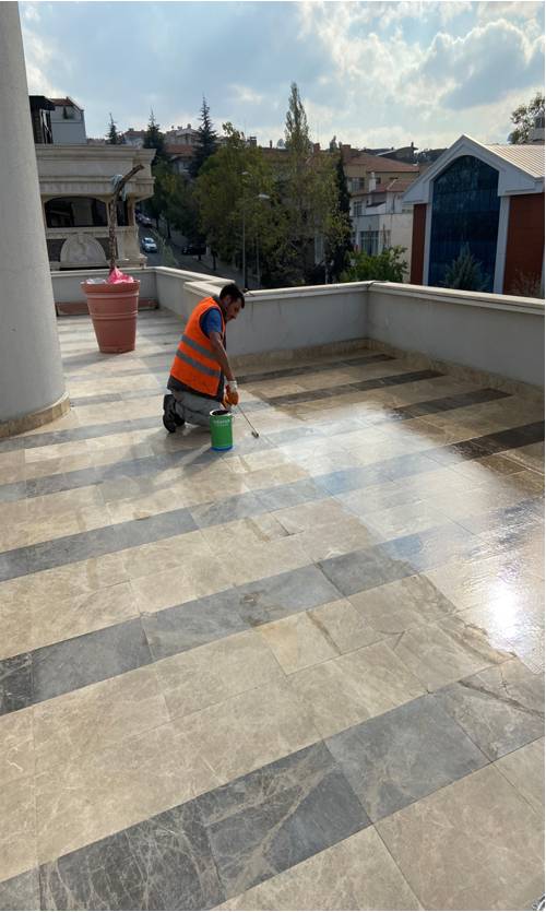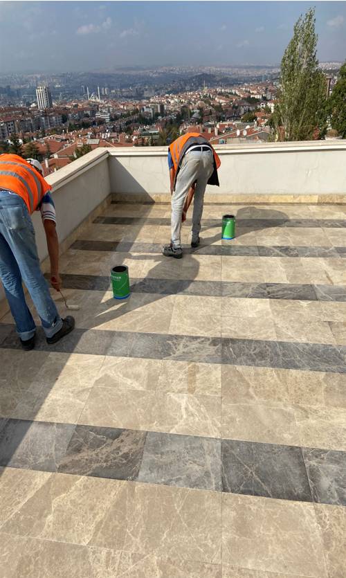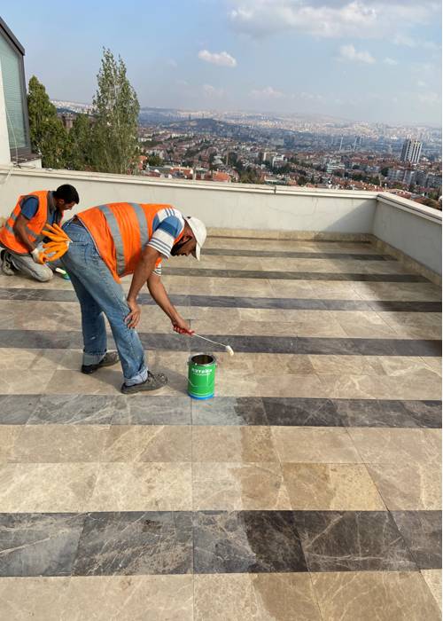 Limak Enerji Merkez Ofisinin teraslarında bulunan mermer kaplama üzerine Epoksi astar sürüldü. Astarın kurumasına müteakip köster BK1000 Şeffaf sürme yalıtım uygulaması rulo yardımı ile iki kat halinde uygulanarak teras yüzeyinde yalıtım sağlanmış oldu.