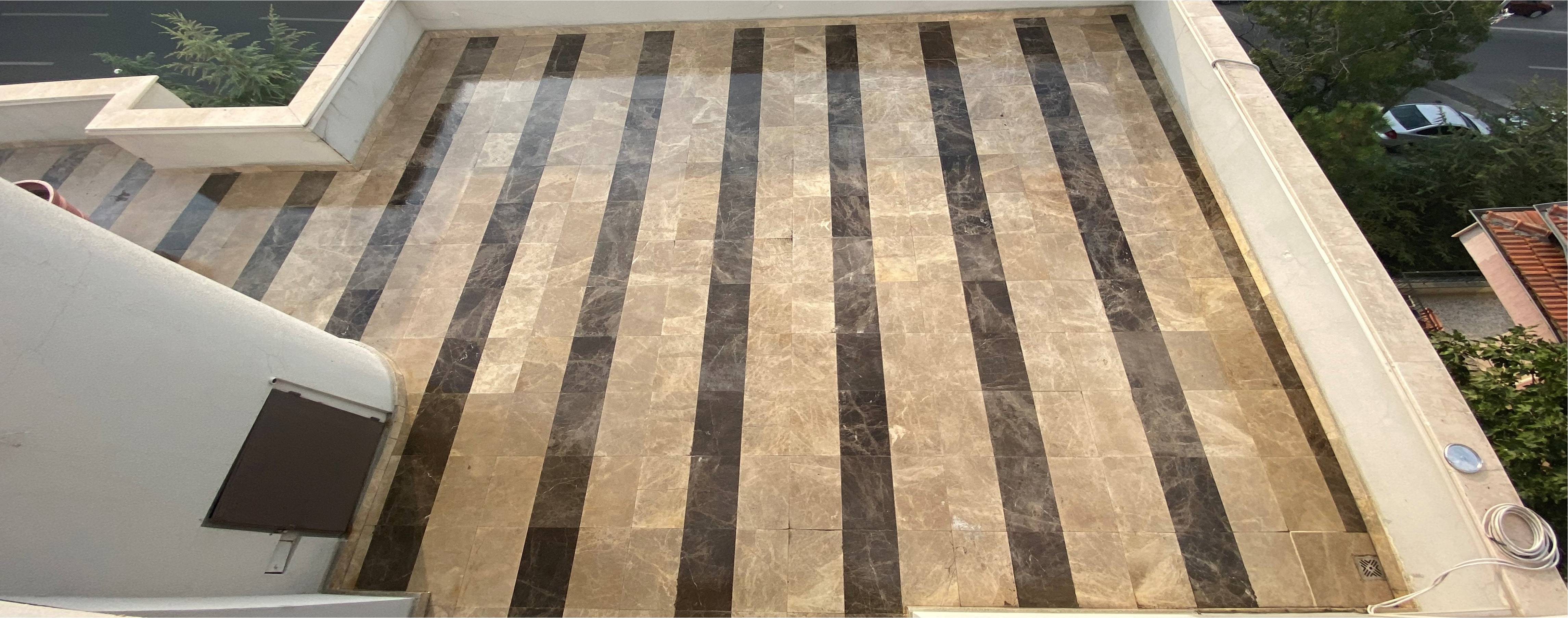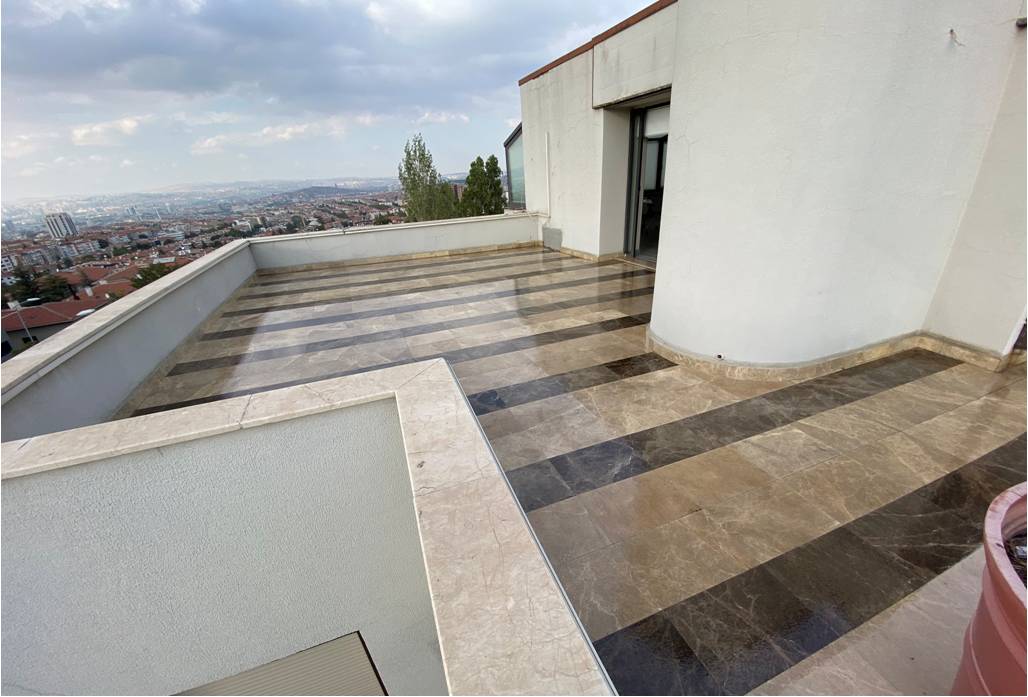 Şeffaf yalıtım uygulamaları sayesinde teras yüzeyindeki mermer görünümünde bir değişiklik olmadı.